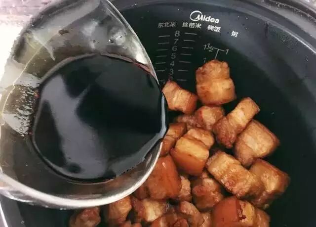 4、将炒好糖色的红烧肉倒入电饭煲,然后将调好的调味汁倒入~