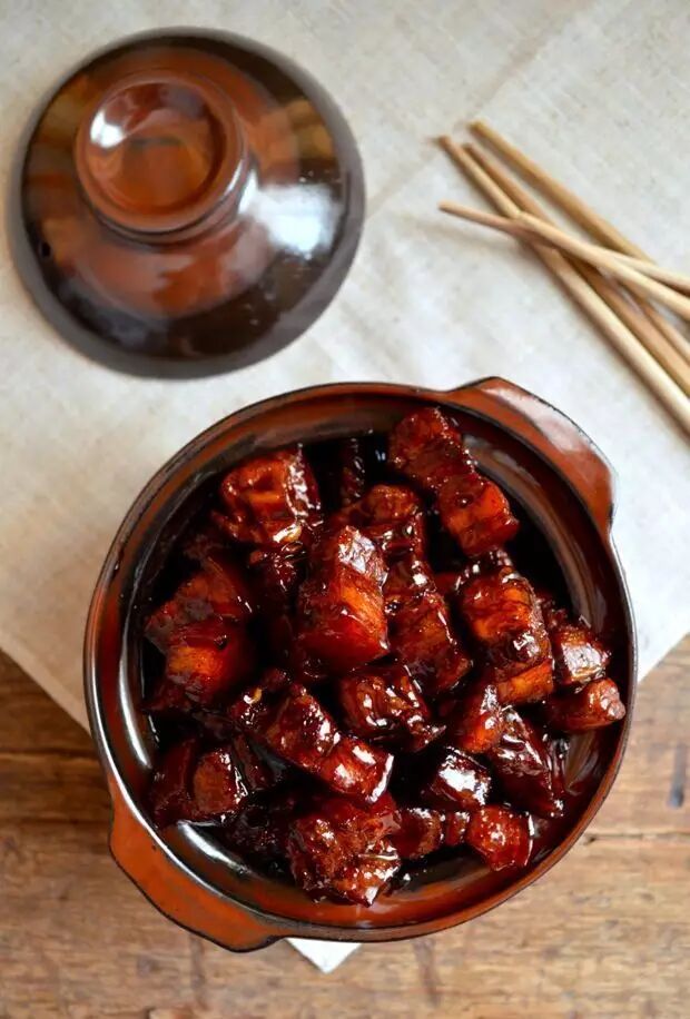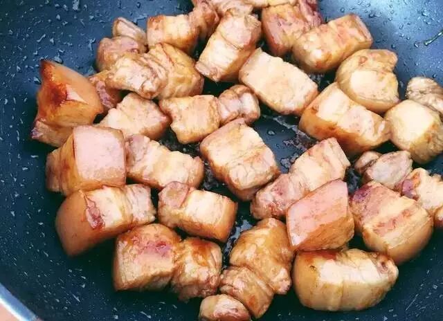 2、打开电磁炉,点击炒菜模式,锅热后放入五花肉煸炒,使肉外表皮焦黄后盛出,火力选择1000,锅中倒入油,油锅半热时放入冰糖,用筷子在锅中慢慢搅拌冰糖,当冰糖全部融化并显出焦糖色开始冒气泡时,糖就熬好了~