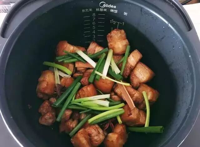 5、放入葱段,倒入热水,盖上电饭煲的盖子~(一定要热水,水刚刚没过肉即可,不需要太多)