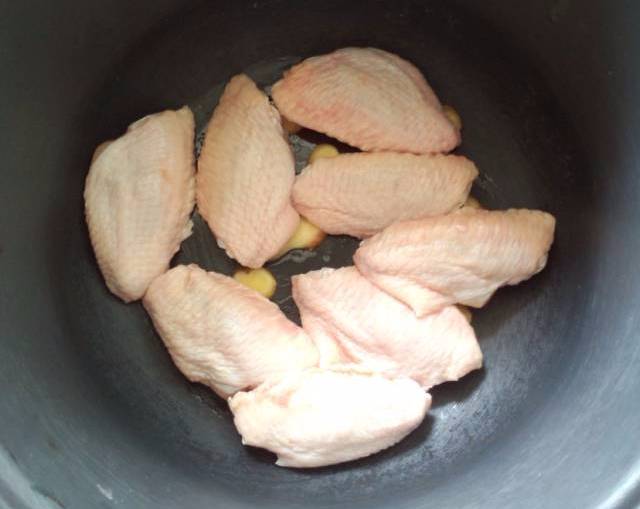 3、放入鸡翅,注意姜片要放在鸡翅底下,去腥,防止粘锅~